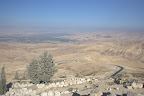 Primera parada el Monte Nebo, el lugar donde Yahvé mostró a Moises la tierra prometida y donde murió sin llegar a pisarla. Su tumba nunca se ha encontrado, pero a pesar de todo hay una iglesia conmemorativa de Moises. Allí hay un impresionante mosaico del año 530, además de la vista del Mar Muerto e Israel. Resulta que el templo está en restauración, bueno, para ser exactos están construyendo un techo (caído hace siglos), así que no podemos ver el mosaico, ni el monumento de la cruz y la serpiente que marca el mirador. Con todo y con eso vemos varios mosaicos y la vista desde otro sitio.